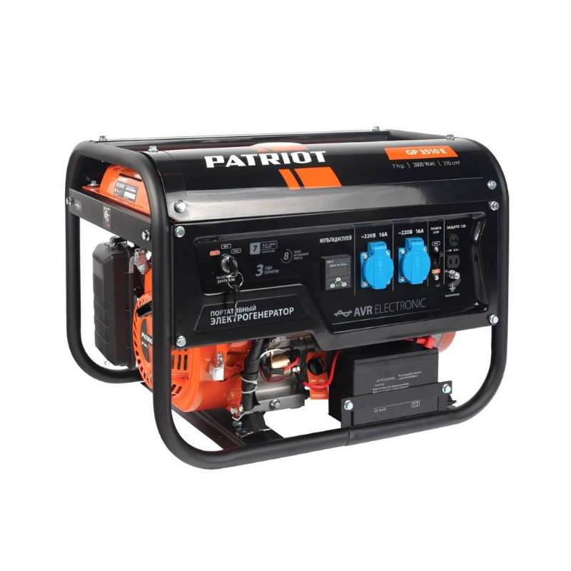 Бензиновый генератор PATRIOT GP 3510E применяется в качестве аварийного или автономного источника электроэнергии для питания маломощных бытовых электроприборов и электроинструмента. Оптимальное соотношение мощности двигателя и электрогенератора обеспечивает стабильную работу на номинальной мощности. Оснащен двигателем с верхним расположением клапанов [OHV], что значительно увеличивает ресурс, снижает выхлоп и уровень шума. Датчик контроля масла исключает запуск и работу генератора при отсутствии или низком уровне масла в картере. Синхронный электрогенератор с системой автоматической регулировки и медными обмотками обеспечивает стабильное выходное напряжение и частоту тока. Электростартер для комфортного запуска генератора. Цифровой электронный мультидисплей позволяет контролировать все выходные характеристики: напряжение, частоту, а также счетчик моточасов помогает следить за интервалами между техническим обслуживанием. Выход 12 вольт позволяет подзарядить автомобильный аккумулятор в экстренном случае. Усиленная передняя панель с утопленными элементами управления снижает риск механических повреждений. Адаптирован под установку транспортировочного комплекта.