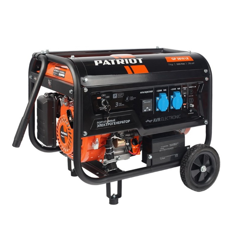 Бензиновый генератор PATRIOT GP 3810LE применяется в качестве аварийного или автономного источника электроэнергии для питания маломощных бытовых электроприборов и электроинструмента. Оптимальное соотношение мощности двигателя и электрогенератора обеспечивает стабильную работу на номинальной мощности. Оснащен двигателем с верхним расположением клапанов [OHV], что значительно увеличивает ресурс, снижает выхлоп и уровень шума. Датчик контроля масла исключает запуск и работу генератора при отсутствии или низком уровне масла в картере. Синхронный электрогенератор с системой автоматической регулировки и медными обмотками обеспечивает стабильное выходное напряжение и частоту тока. Электростартер для комфортного запуска генератора. Цифровой электронный мультидисплей позволяет контролировать все выходные характеристики: напряжение, частоту, а также счетчик моточасов помогает следить за интервалами между техническим обслуживанием. Выход 12 вольт позволяет подзарядить автомобильный аккумулятор в экстренном случае. Усиленная передняя панель с утопленными элементами управления снижает риск механических повреждений. Транспортировочный комплект для перемещения на небольшие расстояния поставляется вместе с генератором.