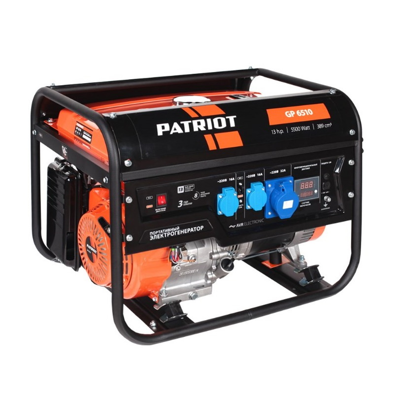 Бензиновый генератор PATRIOT GP 6510 применяется в качестве аварийного или автономного источника электроэнергии для питания мощных бытовых электроприборов, электроинструмента, небольших станков, сварочных аппаратов. Оптимальное соотношение мощности двигателя и электрогенератора обеспечивает стабильную работу на номинальной мощности. Оснащен двигателем с верхним расположением клапанов [OHV], что значительно увеличивает ресурс, снижает выхлоп и уровень шума. Датчик контроля масла исключает запуск и работу генератора при отсутствии или низком уровне масла в картере. Синхронный электрогенератор с системой автоматической регулировки и медными обмотками обеспечивает стабильное выходное напряжение и частоту тока. Установлена мощная силовая розетка 32А для снятия всей мощности генератора с одного выхода (силовая вилка 32А в комплекте). Цифровой электронный мультидисплей позволяет контролировать все выходные характеристики: напряжение, мощность, ток, частоту, а также счетчик моточасов помогает следить за интервалами между техническим обслуживанием. Выход 12 вольт позволяет подзарядить автомобильный аккумулятор в экстренном случае. Усиленная передняя панель с утопленными элементами управления снижает риск механических повреждений. Адаптирован под установку транспортировочного комплекта.