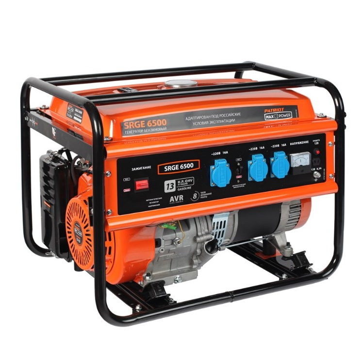 Бензиновый генератор PATRIOT SRGE 6500 применяется в качестве аварийного или автономного источника электроэнергии для питания мощных бытовых электроприборов, электроинструмента, небольших станков, сварочных аппаратов. Оптимальное соотношение мощности двигателя и электрогенератора обеспечивает стабильную работу на номинальной мощности. Оснащен двигателем с верхним расположением клапанов [OHV], что значительно увеличивает ресурс, снижает выхлоп и уровень шума. Датчик контроля масла исключает запуск и работу генератора при отсутствии или низком уровне масла в картере. Синхронный электрогенератор с системой автоматической регулировки обеспечивает стабильное выходное напряжение и частоту тока. Выход 12 вольт позволяет подзарядить автомобильный аккумулятор в экстренном случае. Усиленная передняя панель с утопленными элементами управления снижает риск механических повреждений.