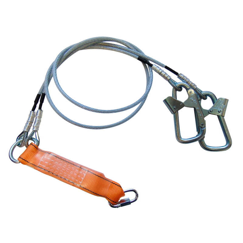 Строп страховочный аБд + Кс (трос) - фал из стального троса в ПВХ оплётке d-8 мм двуплечий с амортизатором двумя монтажным и соединительным винтовым карабином.