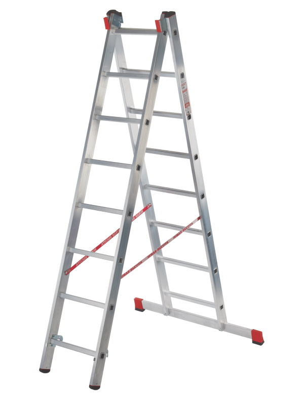 Лестница алюминиевая двухсекционная НОВАЯ ВЫСОТА NV 322 2х8 подходит для выполнения широкого спектра работ. Направляющие и ступени изготовлены из легированного рифленого алюминиевого профиля и имеют дополнительные ребра жесткости. Стальные кронштейны, скобы и зацепы обеспечивают плотный зажим выносной секции.
