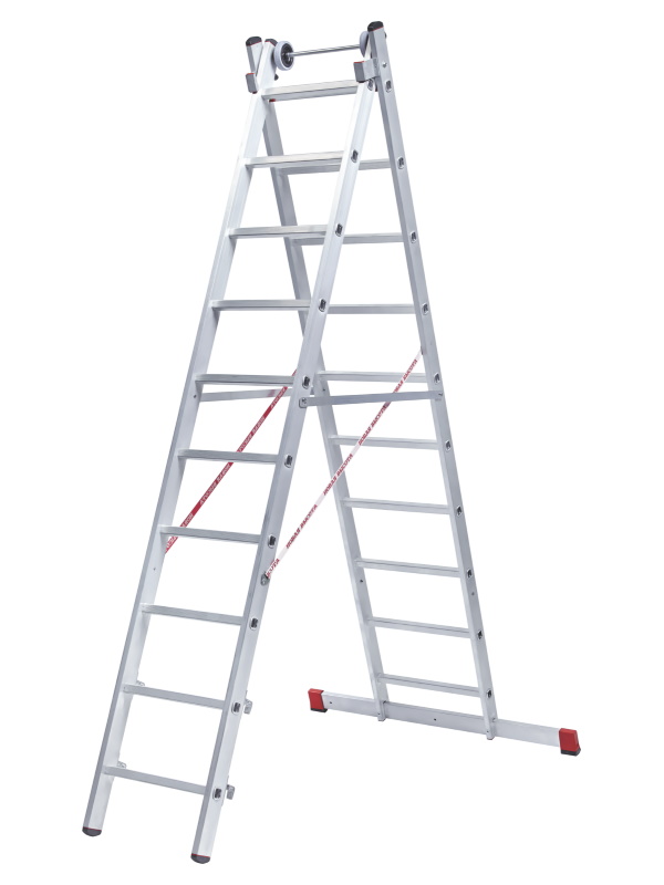 Лестница алюминиевая двухсекционная НОВАЯ ВЫСОТА NV 522 2х19 подходит для выполнения широкого спектра работ. Направляющие и ступени изготовлены из легированного рифленого алюминиевого профиля и имеют дополнительные ребра жесткости. Стальные кронштейны, скобы и зацепы обеспечивают плотный зажим выносной секции.