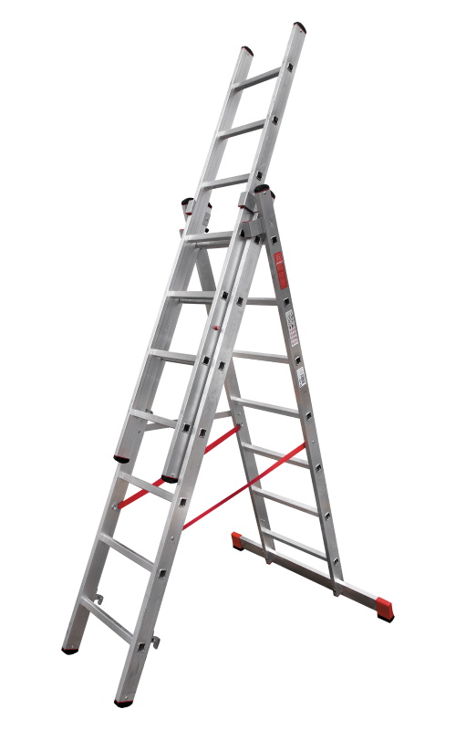 Лестница алюминиевая трёхсекционная НОВАЯ ВЫСОТА NV 3230 3х7 подходит для выполнения широкого спектра работ. Направляющие и ступени изготовлены из легированного рифленого алюминиевого профиля и имеют дополнительные ребра жесткости. Стальные кронштейны, скобы и зацепы обеспечивают плотный зажим выносной секции.