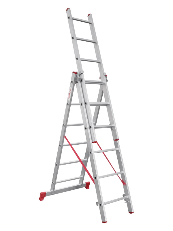 Лестница алюминиевая трёхсекционная НОВАЯ ВЫСОТА NV 2230 3х10 подходит для выполнения широкого спектра работ. Направляющие и ступени изготовлены из легированного рифленого алюминиевого профиля и имеют дополнительные ребра жесткости. Стальные кронштейны, скобы и зацепы обеспечивают плотный зажим выносной секции.