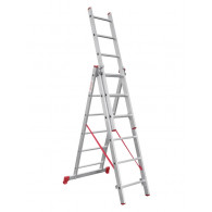 Лестница алюминиевая трёхсекционная НОВАЯ ВЫСОТА NV 2230 3х9 подходит для выполнения широкого спектра работ. Направляющие и ступени изготовлены из легированного рифленого алюминиевого профиля и имеют дополнительные ребра жесткости. Стальные кронштейны, скобы и зацепы обеспечивают плотный зажим выносной секции.
